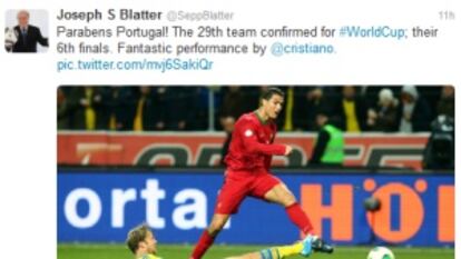 Como fue haciendo con todas las selecciones clasificadas, Joseph Blatter, presidente de la FIFA, felicitó a través de Twitter a la de Portugal por certificar su pase al Mundial de Brasil 2014. En este caso, sin embargo, hizo una excepción. Personalizó en un jugador. Fue Cristiano Ronaldo, autor de tres tantos ante Suecia y al que imitó en una conferencia mientras decía que prefería a Messi.