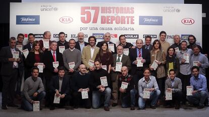 Desde el domingo 22 de diciembre está en los quioscos el libro 57 historias del deporte por una causa solidaria, un volumen de más de 300 páginas que recoge las anécdotas de 57 periodistas deportivos de PRISA. El libro costará 10 euros y el objetivo es recaudar fondos para UNICEF. En concreto para su programa Enrédate, destinado a promover en los colegios españoles el conocimiento de los derechos de la infancia. La presentación del libro, que ha contado con el patrocinio de Kia y Telefónica, tuvo lugar en la sala de encuentros de EL PAÍS.