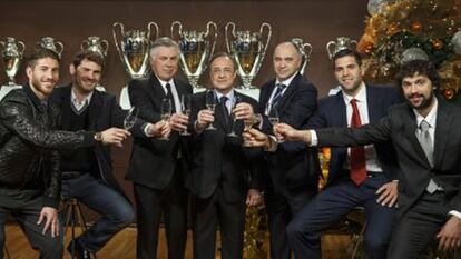 Los capitanes de las secciones de fútbol y baloncesto, junto a los entrenadores y el presidente del Real Madrid felicitaron la Navidad a los aficionados blancos a través de la web y la televisión del club. Florentino Pérez, Carlo Ancelotti, Pablo Laso, Iker Casillas, Sergio Ramos, Felipe Reyes y Sergio Llull expresaron sus mejores deseos para el próximo año en la ya tradicional sesión de fotos y vídeos en la que contaron sus costumbres en estas fiestas.