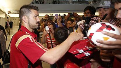 La expedición de la selección española de fútbol ha llegado a Estados Unidos a las ocho de la tarde de este lunes (dos de la madrugada en la España peninsular) tras un vuelo que duró ocho horas y que partió con casi una hora de retraso. La Roja fue recibida en la pista del aeropuerto de Baltimore con los honores propios del campeón del mundo, con los bomberos bañando con sus mangueras el paso del avión de Iberia. En la terminal, unas100 personas ataviadas con uniformes de España dieron una cariñosa bienvenida a los hombres de Vicente del Bosque, que se trasladaron posteriormente a Washington, donde cenaron a base de hidratos de carbono y proteínas.
