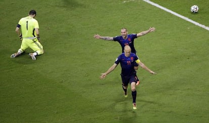 Por lo visto, el intermedio no sirvió de sosiego. Holanda creyó en sí misma y a España, a esta España de cuajo, se le aflojaron las piernas de forma misteriosa. Se resquebrajó en todas las zonas del campo y a gente como Robben y Van Persie no conviene darle ánimos. El primero se la debía a sí mismo, víctima de Casillas como se fue de Johanesburgo. En Bahía le ganó el duelo más que con creces, hasta el punto de lograr que el capitán español se hiciera un nudo en el cuarto gol, el segundo de Van Persie, y le faltara contundencia en el tercero, el de De Vrij, por más que tuviera algo de razón en reclamar falta de Van Persie. Holanda sacudía por todos los lados, España estaba fundida, sin que la entrada de Torres y Pedro supusiera un alivio.