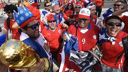 Una gigantesca bandera chilena dejaba claro esta mañana quién manda en el recinto de la Fan Fest. En Maracaná, escenario de la batalla, sucede algo parecido desde que a las diez de la mañana empezara a cortarse el tráfico en los alrededores: camisetas rojas, blancas y azules, al grito de “¡Vamos Chile, carajooo!”, exhiben su entusiasmo ilimitado. “Dale, dale, dale, dale, dale, Chile…” La proximidad geográfica ha hecho que las hinchadas latinoamericanas colonicen algunos estadios de esta Copa hasta apropiarse de ellos por un día: sucedió en Belo Horizonte con Colombia y sucede hoy en Maracaná, donde casi la mitad de los 74.871 asientos estarán ocupados por aficionados chilenos.