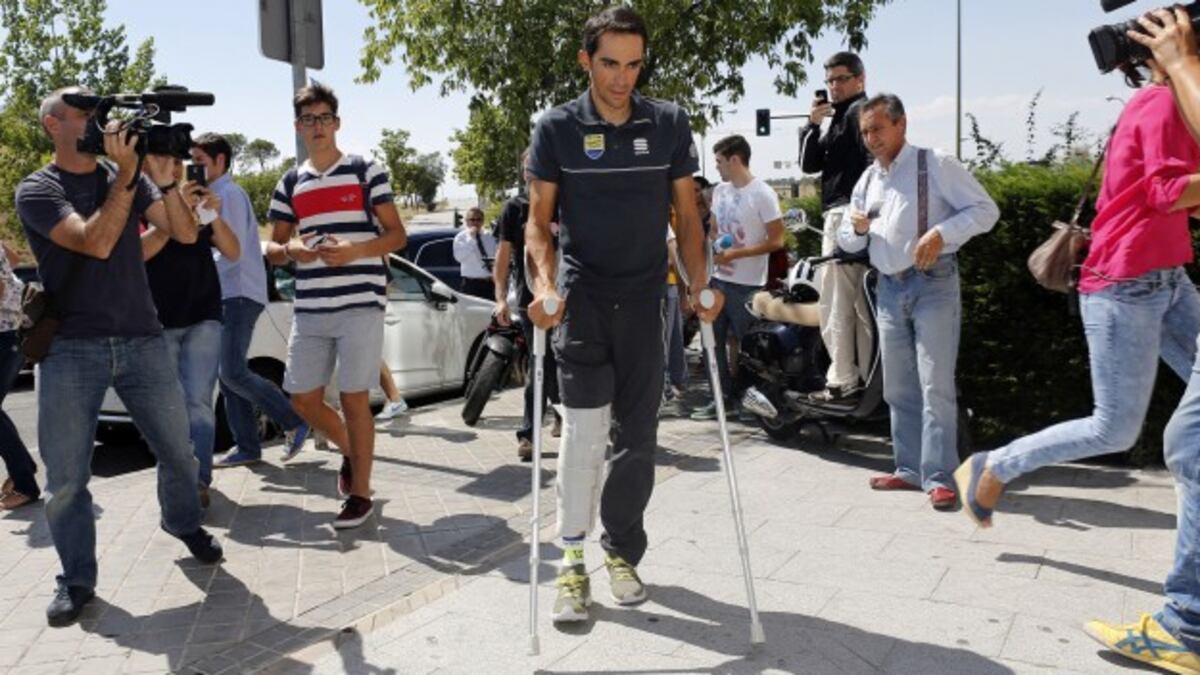 El doctor Manuel Leyes, que examinó a Contador en la clínica madrileña, aseguró que el ciclista esquivará una intervención quirúrgica. “El doctor me ha dicho que una operación aumentaría el traumatismo que ya ha sufrido la rodilla y retrasaría todavía más la recuperación. La buena noticia es que no tengo ningún tendón ni ligamento lesionados y que la fisura está en el mejor sitio posible. Al menos tendré que estar dos semanas parado y, hasta que no cicatricen las heridas, con la pierna inmovilizada”, dijo Contador.