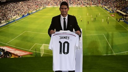 Con traje negro y actitud comedida, James Rodríguez bajaba ayer las escaleras del palco de honor del Santiago Bernabéu. Más de 30.000 personas coreaban su nombre. Fuera, cientos de personas buscaban la forma de entrar al estadio.