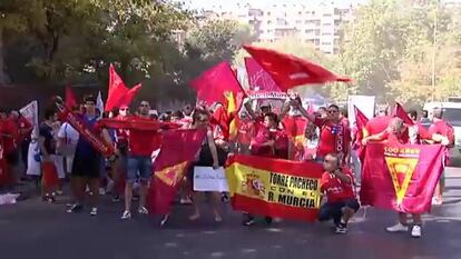 Durante la mañana, se sucedieron los cánticos de los aficionados del Murcia, que precedieron al anuncio de que su equipo abandonaría las categorías profesionales del fútbol español: “La sede de la Liga, la vamos a quemar”, gritaba el gentío mientras dos policías como dos torres vigilaban la entrada. Alguien contestaba: “¡Gasolina hay!”. Estallaban los aplausos. Los silbidos. Se mezclaban, casi todos con sus camisetas rojas del Murcia, adultos, madres y niños, asombrados frente al humo de una bengala prendida sobre el asfalto. Muchos llegaban con sus carteles escritos a mano y sus pancartas serigrafiadas. “SOS Murcia”, se leía. Otros acusaban a la Liga de querer que su plaza en Segunda la ocupara el Castilla, filial del Real Madrid descendido a Segunda B el pasado curso (en realidad, lo hará el Mirandés; “No tendrá ningún problema”, dijo Tebas). Los pocos conductores que circulaban en la mañana de agosto por Madrid miraban atónitos la escena, que parecía sacada directamente de un estadio de fútbol.