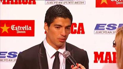 “A nivel personal e individual, un premio siempre es bienvenido. Pero éste no lo hubiera logrado sin mis compañeros en el Liverpool”, se arrancó Luis Suárez. “Me hubiese gustado poder estar allí”, intervino Steven Gerard, amigo del ariete, a través de un vídeo. Como fue Imposible que el capitán del Liverpool le entregara el premio, Suárez lo recibió de manos de otro mito de Anfield, su exentrenador, Kenny Dalglish. Un premio que otorga la Asociación Europea de Medios Deportivos al máximo goleador de las ligas europeas. En su caso, por haber logrado 31 tantos en 33 partidos. La distinción la comparte con Cristiano Ronaldo, con quien empató. Sin embargo, el delantero del Madrid, que el martes jugó frente a Dinamarca con Portugal no pudo estar presente en la gala celebrada por Marca en la Antiga Fàbrica Damm de Barcelona. “Quiero agradecérselo a las personas más importantes de mi vida, mi mujer y mis hijos”, dijo Suárez, bajo la atenta mirada de su esposa, Sofía Balbi. Arropado también por su agente, Pere Guardiola; el presidente del Barcelona, Josep Maria Bartomeu; Andoni Zubizarreta y Carles Puyol, de la secretaría técnica; y de tres de los cuatro capitanes del primer equipo (Xavi, Iniesta y Busquets). Sólo faltó Messi, recién aterrizado de Hong Kong. “Ahora viene una etapa que hay que disfrutar. Estoy cumpliendo un sueño”, aseguró el suramericano. “Mis hijos y yo estamos muy orgullosos de él”, se animó a decir su mujer.
