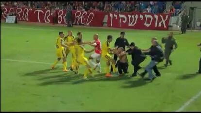 El derbi de Tel Aviv entre el Hapoel y el Maccabi tuvo que de ser suspendido después de que Eran Zahavi, del Maccabi, se enfrentara a puñetazos y patadas con un aficionado que saltó al campo para agredirle y se desatara una vergonzante batalla campal. La prensa califica este martes de "vergüenza" y "noche más aciaga de la historia del fútbol en Israel" las agresiones que se sucedieron en un abarrotado estadio Bloomfield después de que Zahavi, exjugador del Hapoel, empatara el partido de penalti y lo celebrara con un gesto desafiante para su exafición.