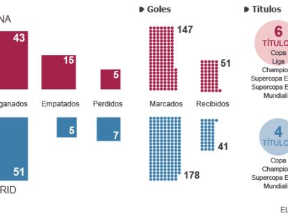 Si no fuera por la Liga y la Supercopa de España perdidas, la evolución sobre el máximo rival sería más fácil de constatar. En 2009 el Barcelona ganó todos los trofeos que se pueden disputar: Liga, Champions, Copa del Rey, Supercopa de España, Supercopa de Europa y Mundial de Clubes. Establecer paralelismos es un ejercicio complejo más allá de ciertas variables evidentes. Ha pasado el tiempo y las condiciones de la competición se han modificado. En las últimas cinco temporadas la gran mayoría de los equipos de Europa se han debilitado en relación al Madrid, el Barcelona, el PSG, el Bayern, el Chelsea y el Manchester City.