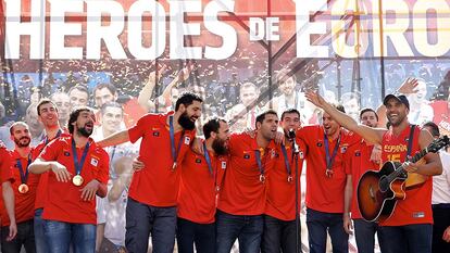 “¿Vamos a cantar un poco, no? ¡Somos campeones de Europa!”, prosiguió Sergio Rodríguez, de pocas palabras pero de asistencia rápida, un reflejo de su comportamiento habitual. “¡Es la medalla que me faltaba!”, celebró el base canario. “Pocos contaban con nosotros pero lo hemos conseguido”, recogió el testigo Sergio Llull. “No quiero olvidarme de todos los que trabajan con nosotros cada día para que podamos saltar a la pista”, señaló el menorquín, mientras señalaba al cuerpo médico de la selección española. Los mismos para los que Rudy Fernández, que disputó todo el Eurobasket con problemas en la espalda, tuvo también una mención especial. “Gracias a ellos he podido estar bien”, se congratuló el mallorquín.