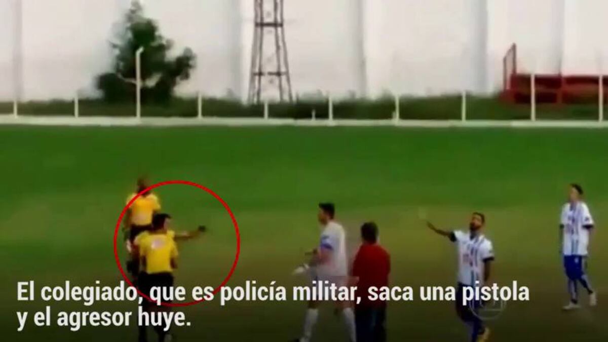 Un hecho insólito acontenció en Brasil, durante un partido de fútbol de la liga regional de Brumadinho, en el estado de Minas (Belo Horizonte). Se enfrentaban el Amantes Da Bola y el Brumadinho FC cuando el árbitro decidió expulsar a uno de los jugadores locales. Todo el banquillo saltó al campo y el sancionado agredió al colegiado con una patada. El árbitro, que es policía-miltar, según informan los medios locales, sacó una pistola en medio del terreno de juego. El agresor huyó. Nadie fue detenido.