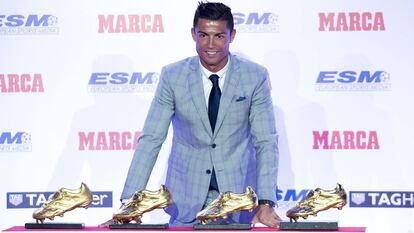 Cristiano Ronaldo ha recibido en el Hotel Westin Palace de Madrid la Bota de Oro que le acredita como máximo goleador liguero a nivel europeo de la pasada temporada, en la que firmó 48 dianas. Es la cuarta que logra -2007/2008 (31), 2010-2011 (40) y 2013/2014 (31)-, siendo el jugador que más veces la ha ganado superando en una a su máximo competidor, Leo Messi. Pero el portugués, ambicioso, no se conforma.