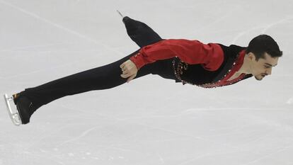 Es, a priori, tan superior a sus rivales en el Europeo, que Javi se permitió el lujo de probarse como ya hizo en el último Campeonato de España. Con solvencia, volvió a ejecutar la coreografía que ha configurado con la ayuda de Antonio Najarro, director del Ballet Nacional, con elementos de flamenco, guitarra de Paco de Lucía y la voz de Plácido Domingo. Primero ejecutó una combinación cuádruple toe (despegue hacia atrás con el pico del patín izquierdo y aterrizaje con la derecha también hacia atrás) más un triple toe, donde cometió un fallo; después abordó el cuádruple salchow (se inicia con la pierna izquierda hacia atrás y se cae con la derecha hacia atrás), y acabó con un soberbio triple axel. Una suma de elementos al alcance de muy pocos.