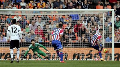 El inició del partido desmintió el desenlace final. El Valencia se propuso no dar opciones al Sporting, sometido a la intensidad del conjunto che comprometido, superior en todas las facetas del juego al equipo asturiano, con el recuperado Feghouli tras dos meses de ausencia por lesión y Piatti percutiendo por las bandas. Cuestionado su rendimiento hasta la fecha, pretendido por varios equipos en el mercado invernal, el extremo argentino, activo durante el primer acto sustituido al poco de comenzar el segundo, tuvo la ocasión al cuarto de hora de poner en ventaja al Valencia tras un disparo interceptado por Cuéllar tras una acción de André Gomes. Anteriormente la gozó Negredo asistido también por el portugués. Al delantero vallecano, de nuevo capitán, le sigue faltando chispa y velocidad para dar lustre a sus buenos movimientos y alcanzar los remates.