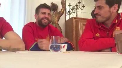 El barcelonista, secundado por Cesc Fàbregas, transmitió a Casillas las preguntas de sus seguidores. "¿Qué jugador del Barça te cae mejor?", "Tu mejor momento en el Madrid", "¿Cuáles son los mejores porteros?". El capitán lidió lo mejor que pudo el "atraco" y no dudó en dejarle claro a Piqué lo que pensaba sobre él: "Estás como una regadera", repitió un par de veces con humor.