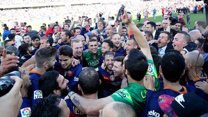 Apareció entonces de nuevo Suárez para concluir una triangulación con Messi y Neymar. No había mejor manera para celebrar el título que una combinación del tridente, la apuesta de un equipo que necesitó ganar dos veces la Liga después de su derrota contra el Madrid. El equipo se sobrepuso al 1-2 y desde la madurez convirtió la defensa del liderato en una cuestión de vida o muerte cuando se discutía sobre el ridículo que habría supuesto perder el torneo el último día en Granada. Aunque la Champions se escapó, nadie puede discutir que el único actor de la Liga ha sido el Barça del regular Suárez.