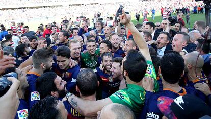 Pero los tres goles del uruguayo no desanimaron a una afición que estaba para disfrutar, que por algo ha padecido de lo lindo durante la temporada con la amenaza del descenso. E incluso se animaron a la jarana cuando Cuenca no tiró el balón fuera con Luis Suárez en el suelo; bien pudo acabar en remate del Granada. Entonces, mientras la afición coreaba el nombre del extremo, todos los jugadores del Barça menos Ter Stegen fueron a recriminárselo. Y pudo acabar mal, aunque el colegiado hizo caso omiso a la gresca. Pero sin otros incidentes, más allá de una posible lesión de Mascherano en la rodilla y del abundante polen que circulaba por el estadio, se dio el pitido final. Celebró el Barça con entusiasmo, pero fue breve el festejo en el césped porque la afición del Granada invadió el campo para acercarse a los campeones. Fue tal el agobio que los jugadores del Barcelona debieron irse escoltados entre la marabunta a los vestuarios. Un festejo entrecortado, un festejo compartido pero sobre todo un festejo azulgrana, ganador de la Liga.