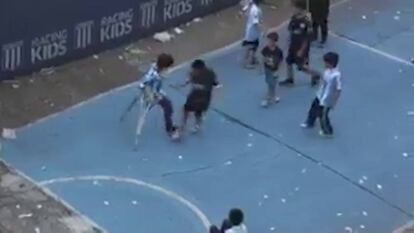 Un niño argentino con la pierna amputada presta su bastón a otro para poder seguir un partido