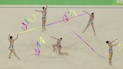 Desafiaron a Rusia, el dream team de la gimnasia rítmica, la pusieron contra las cuerdas en la primera rotación y solo un soberbio mixto (6 mazas y dos aros) pudo con esta España gigante sobre el tapiz que guardó para su cita más importante, el desafío olímpico, su mejor actuación. El trabajo, las horas de entrenamientos y el dolor invisible de unos cuerpos desgastados por las contorsiones recibieron este domingo una plata como recompensa descomunal al trabajo de toda una vida. La de Alejandra Quereda (24 años), Sandra Aguilar (24), Lourdes Mohedano (21), Elena López (21) y Artemi Gavezou (22) fue la 15ª medalla (de las 17 totales) para la delegación española en Río, la quinta de plata.