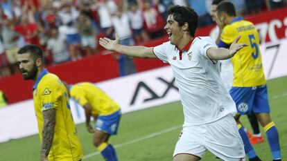 Un gol de Carlos Fernández en la última jugada del partido le dio el triunfo al Sevilla ante Las Palmas, que llegó a Nervión como líder y se marchó con la sensación de haber perdido, al menos, un punto en un duelo disputado bajo un sofocante calor. En realidad, el Sevilla le dio la vuelta al partido, que perdía 0-1, en cinco minutos. Primero, en el minuto 88, con una jugada donde Vitolo lo puso todo para que pareciera que Bigas se lo llevaba por delante. Acción muy complicada para el árbitro. Parece un claro penalti, pero no lo es. En directo, lo pareció, y evidente.