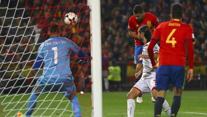Más horizontal que vertical, la selección se dedicó a susurrar con la pelota hasta que llegó la fatalidad de Velkovski que cabeceó del revés un centro de Carvajal. Antes del gol dislocado del macedonio, apenas tuvo foco Dimitrievski, el meta suplente de Macedonia, que jugó de urgencia por lesión del titular durante el calentamiento. En el primer tramo, el portero del Nàstic de Tarragona solo fue exigido tras una jugada de rechace que no le cundió a Morata. Y tampoco a Silva, cuyo remate posterior desvió un defensa visitante. A España no le fue mucho mejor en el perímetro de De Gea. A la zaga, improvisada con Bartra y Nacho como centrales, le faltó contundencia en dos saques de esquina que casi embocan Mojsov y Pandev. Demasiado borrón ante un adversario tan de la cola del fútbol europeo.