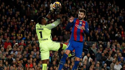 La pelota quedó a pies del Barcelona. Tensos en la contención, los azulgrana persistieron en la posesión y la recuperación, y pareció que rompían bien por los costados de Neymar y Sergi Roberto. Aunque a los barcelonistas les faltaba profundidad y finura, cayeron un par de muy buenas ocasiones, bien resueltas por Kameni, siempre espléndido en el Camp Nou, soberbio ante Piqué y Rafinha. El equipo de Luis Enrique, sin embargo, se apagó poco a poco, al mismo ritmo de Alcácer, buen asistente y pasador y torpe en el remate, desmoralizado desde que pifió un centro de Sergi Roberto. Al Barça le faltaba la contundencia y precisión que se suponen a un 9.