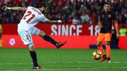 La disciplina del Valencia provocó situaciones muy delicadas para el Sevilla, incapaz, en ocasiones, de sacar la pelota desde su zaga. Dispuesto con solo tres defensas y sus líneas muy espaciadas, la mejor ocasión de la primera parte llegó en un error infantil de Rami, que jugó un balón horizontal en su área. Parejo lo interceptó, pero Pareja llegó muy rápido para evitar el tanto del centrocampista. Una vocal y un mundo separan ahora a ambos futbolistas. El Sevilla solo sorteó la presión del Valencia en una ocasión. Fue una delicia. Toques y toques para que Pareja deslumbrara con un espectacular pase de más de 40 metros a Sarabia. Vázquez le pegó con saña, pero el balón salió rozando el poste.