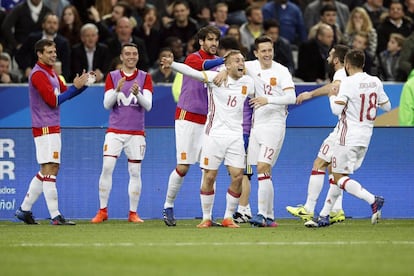 Pese a la puesta en escena del juvenil delantero parisino, Francia se refugió sin demora, dispuesta al contragolpe, al turbo del muchacho y de los ya curtidos Griezmann y Gameiro. A partir de Carvajal, el conjunto de Lopetegui encontró la vía de evacuación. Con Rabiot —que no es futbolista de pico y pala— y Kurzawa como únicos alguaciles por ese costado, entre Carvajal, Koke y Pedro —muy activo y preciso en su regreso internacional— anudaron a los galos. Todo sucedía por la orilla del lateral madridista. Deschamps había ordenado cerrar el embudo, los cráteres estaban en las bandas y la Roja lo interpretó de maravilla. De costa a costa, como si se tratara de una ofensiva de balonmano, la selección española tuvo la paciencia necesaria para atornillar a su adversario en el balcón de su área. Sin Costa, Vitolo y Silva de entrada, los goleadores de la recién iniciada andadura de Lopetegui, al equipo solo le faltaba picante. Koscielny arrestaba a Morata en el cuerpo a cuerpo con lo que España necesitaba llegadores al asalto. Iniesta no acostumbra a flirtear con el gol, pese a que en su historial figuren algunos para la eternidad, pero en París fue el que más sumó a la causa. Un remate, tras bailar sobre la cintura de un par de rivales, se le fue un por una falange. En otro, con el empeine exterior, se topó con Lloris, el meta local.