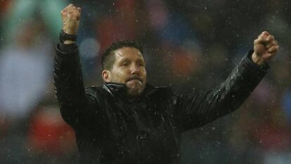 Se abrió la puerta de la atestada sala de prensa del Vicente Calderón y emergió Diego Pablo Simeone decidido, reforzado por una sonrisa que se preocupó de remarcar muy mucho. Eliminado, pero entusiasmado por la actuación de sus muchachos, por haber logrado que durante 40 minutos el Madrid viviera en el alambre de la eliminatoria. No había rastro del entrenador derrotado y hundido que hace poco menos de un año en San Siro puso en jaque a la dirigencia atlética y a su afición con aquel amago de marcha. “Estoy feliz”, dijo para justificar su dilatada sonrisa.