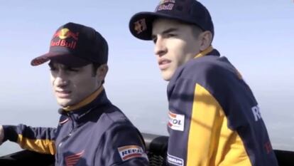 Los pilotos del equipo Repsol Honda sobrevuelan Montmeló antes de subirse a la moto en el gran premio de Cataluña