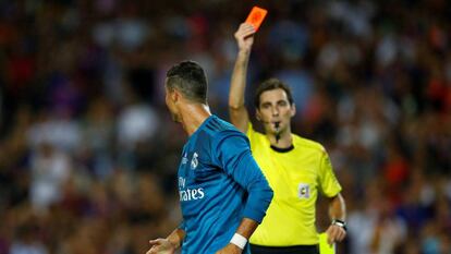 Un acto de reivindicación provocativo que le costó muy caro a Cristiano. La escena, que se resolvió primero con una amarilla, terminó siendo decisiva para que su momento durase solo 180 segundos. Fue el tiempo que transcurrió entre su celebración y la acción en la que árbitro volvió a amonestarle y le enseñó la roja acusándole de simular un penalti en un forcejeo con Umtiti. La decisión del colegiado encendió al portugués hasta el punto de propinarle un leve empujón que puede dejarle fuera del inicio de competición liguera. De Burgos Bengoechea apuntó en el acta que el portugués le empujó “levemente en señal de disconformidad”. El acto de rabia le puede acarrear a Cristiano una fuerte sanción de partidos, igual que a Simeone en 2014, cuando, también en una Supercopa, fue expulsado por dar un toque en la cabeza al cuarto árbitro. El castigo para el técnico argentino fue de ocho partidos por diversos conceptos. El artículo 96 del reglamento dice que "agarrar, empujar o zarandear, o producirse, en general, mediante otras actitudes hacia los árbitros que, por solo ser levemente violentas, no acrediten ánimo agresivo por parte del agente, se sancionará con suspensión de 4 a 12 partidos"