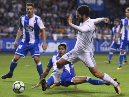 De las mil caretas que tiene el Madrid, esta vez eligió ponerse el frac para mimar el balón, de pie en pie, sin extravíos. Sin una sigla de la BBC, la presencia de un medio más, en este caso Isco, facilita el gobierno, el fútbol más pausado. No de forma retórica, sino para escudriñar al adversario, despistarle por aquí y por allá y sacar el florete en el momento oportuno. Al toque de Isco, Kroos y Modric entró en escena el equipo de Zidane. Pero resulta que mientras abanicaba a su antojo la pelota, el Deportivo le cazó tres veces en un periquete. Más que el Deportivo, Andone, un corsario con alma de Capitán Trueno que se gana las habichuelas por su cuenta en la delantera de los de Mel. Un tipo capaz de chocar con una tanqueta, lo suyo es el cuerpo a cuerpo y así sacó la cadena a Carvajal. Keylor respondió tan bien como un par de minutos después cuando Andone pilló con la caraja a Sergio Ramos (que bien pudo ahorrarse la expulsión en el último suspiro). El Madrid amenazaba con el balón; el Dépor, con Andone. Hasta que Nacho, que siempre es Nacho, lo que es más de lo que pueda parecer, le ganó cada pulso al rumano. Fin del Deportivo y fin de Andone, que hasta falló un penalti muy cerca del final.