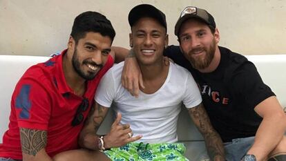 Aunque ya juega y golea en el PSG, Neymar no se acaba de ir del Barça ni de separarse del tridente que formó en el Camp Nou con Messi y Luis Suárez. Melancólico en la cancha, el argentino apareció ayer sonriente junto al brasileño y al uruguayo en una foto que el propio rosarino colgó en Instagram a las 19.09 horas, después que el club azulgrana anunciara que demandaba a Neymar. A la instantánea de Messi le siguieron una serie de imágenes más, divulgadas por Neymar y diferentes futbolistas azulgrana, que daban cuenta de la visita a Barcelona del brasileño y de Alves, y reproducían también el famoso tuit de Piqué con el “se queda” en referencia al exdelantero del Barcelona.