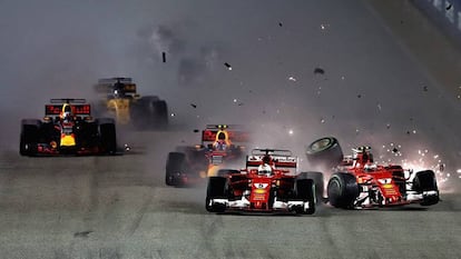 El golpe de teatro se produjo en la misma salida del Gran Premio de Singapur de Fórmula 1. Allí se decidió en gran parte una carrera que no pudo tener peor inicio. Cuando los semáforos se pusieron en verde, Raikkonen intentó adelantar por la izquierda a Verstappen y ambos coches se tocaron al enfocar la primera curva, para volver a chocar de una forma mucho más virulenta en la siguiente y arrastrar en su trifulca a Fernando Alonso y tocar también a Vettel, que perdió todo el tren delantero y acabó realizando un trompo, teniendo que abandonar. Fue un pésimo comienzo para Ferrari que, incluso bajo la lluvia inicial, vislumbraba la posibilidad de conseguir incluso un doblete.