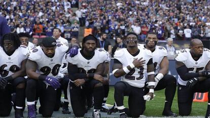 Minutos antes del inicio del encuentro de este domingo, el entrenador Mike Tomlim le comentó a la cadena televisiva CBS que el equipo no iba a salir a la ceremonia como protesta a los comentarios de Trump. A lo largo del fin de semana, el presidente había atacado a este colectivo deportivo por los jugadores que desde hace un año se arrodillan cuando suena el himno en señal de protesta por la violencia policial contra los afroamericanos. Trump incluso llamó "hijo de puta" a Colin Kaepernick, el iniciador de este gesto.