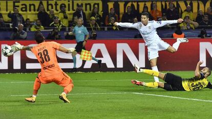 No es el Borussia un conjunto que se abrume con facilidad. Tiene metabolizado hasta el hueso su papel de equipo revoltoso en Europa y ni siquiera su fogosa hinchada le exige un pedestal del que le bajan cada verano el Bayern y otros multimillonarios carpantas del fútbol europeo. Con 0-2, Aubameyang, al que ha mantenido con el gancho en la plantilla, le devolvió al partido con una descarga de nueve puro, una anticipación a Sergio Ramos. Un gol para medir de nuevo al Madrid, y más en el cráter de Dortmund, donde no había descorchado un triunfo en sus seis visitas anteriores. Con el Borussia de vuelta al partido, el Madrid tuvo la mejor respuesta posible de su mejor actor. Modric puso en liza a CR y éste descerrajó a Bürki, meta local, con una estocada al lado más protegido por el portero suizo. Cristiano a lo Cristiano, de gol en gol y dale que dale. Por si acaso, él afeitó al cuadro alemán, ya rendido en el tramo final. Y solo un guiño negativo para el madridismo. En su mejor día del curso, también Bale tuvo en vilo a los suyos y se fue acalambrado. Por fortuna para el Madrid, el choque estaba despejado. Veremos si en Dortmund cogió pista para Chamartín.