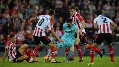 El partido era una tentación para el adocenamiento, como esas tardes grises y lluviosas en que no apetece salir de casa. Con el centro del campo tan poblado, con futbolistas tan pegajosos y laborantes, el Barça sin extremos, el Athletic sin continuidad, el fútbol se movía como un petrolero en un riachuelo, sin sitio para maniobrar, sin espacio para correr. Era una buena noticia para el Athletic, que se sentía jugando de igual a igual. No era el hijo de un dios menor cuando buena parte de la parroquia de la Catedral estaba dejando de creer en ese dios tras los malos resultados. Incluso el Barça se asomó al partido sumando errores en el pase que le hacían más terrenal que de costumbre. Buenas noticias para San Mamés, que, sin tocar el cielo, al menos salía del infierno. El Barça colocaba en las bandas a Rakitic y André Gomes como guardianes de las anunciadas subidas de Sergi Roberto y Jordi Alba. Pero no había nada que guardar ni nada que subir. El Athletic se apuntó a la tarea de apresar a Busquets para cortar la boca de riego, a sabiendas de que sin Iniesta, el riesgo de sequía era más que evidente.