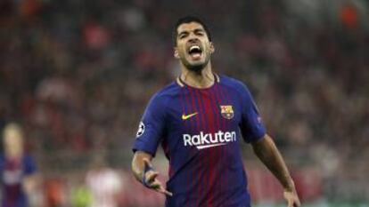 Luis Suárez acabó de mala manera el partido de Atenas. Los desaries del ariete son cada vez más visibles, contrariado porque se le niega el gol en la Liga —el último que marcó fue contra el Atlético— y en la Champions —no ve la portería en campo contrario desde el 16 de septiembre de 2015 en Roma. El uruguayo solo ha marcado tres goles en los 13 partidos que ha jugado después que se perdiera cuatro por una lesión en la rodilla que podría obligarle a pasar finalmente por el quirófano.