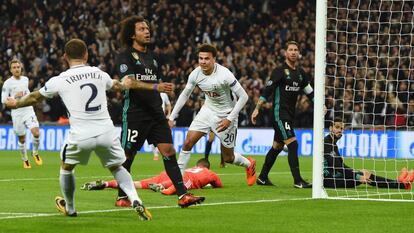 Perdido el Madrid, los Spurs amenazaban más que remataban. Cada movimiento de Dele Alli y Kane era inquietante para la defensa madridista. Hasta que se acabó el fogueo. Trippier se descolgó de nuevo por la ruta de Marcelo, el asistente de turno no se percató del fuera de juego del zaguero inglés y su centro lo embocó Dele Alli. Nacho llegó al quite con retraso y Kiko Casilla, demasiado remiso, no marcó territorio en el área chica. Sin alardes, pero con un partido muy bien abrochado, el Tottenham puso a rebufo al Madrid y decidió entonces envidar al contraataque. Veta que explotó de maravilla.