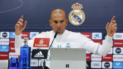 A la hora de la comida apareció este martes Zinedine Zidane por la sala de prensa de Valdebebas. Lo hizo con una hora y media de retraso al que suele ser el horario habitual para sus comparecencias. Había estado reunido con la plantilla madridista en el vestuario. Le dijo a los jugadores, según un testigo, que el principal culpable de la situación del equipo —a 16 puntos del Barcelona en la Liga— es él, que todos son importante para sacar esto adelante y que, entre todos, aportaran soluciones para salir del agujero.