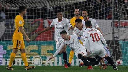 25 segundos. Un periodo de tiempo que puede resultar eterno según las circunstancias pero que en fútbol apenas se traduce en nada. Sin embargo, en un estadio como el Sánchez Pizjuán y en una noche especial, fue un lapso temporal más que suficiente para que el Sevilla realizara una jugada espectacular y le marcara al Atlético, un prodigio en la parcela defensiva, un ejemplo siempre de concentración y orden. Virtudes que resultaron desbordadas por la calidad y el remate de los jugadores de este Sevilla relanzado por Montella. El espectacular golpeo de Escudero a centro de Sarabia tuvo la virtud para la eliminatoria de despojar ya de miedos al Atlético, quien reaccionó con la clase y la raza de los equipos grandes. Fue un acto de Copa en estado puro. Simeone ordenó al equipo con una zaga de tres y Vrsaljko y Saúl comenzaron a hacer estragos en ataque por las bandas de un Sevilla sostenido por un eficiente N'Zonzi.