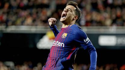 La mística del Barça con la Copa no la rompió ni el ardor de Mestalla. Ya son 29 títulos azulgrana y 40 finales, las cinco últimas consecutivas, la próxima contra el Sevilla el 21 de abril. El equipo de Valverde tuvo en Valencia la misma jerarquía que en su día mostraron los barcelonistas con Luis Enrique o Guardiola. No juega el Barcelona por jugar la Copa, una competición que supone un desgaste brutal, sino que no para hasta que se entrega el trofeo, ya sea en Mestalla o Madrid. La novedad de anoche estuvo en el goleador: Coutinho. El brasileño estuvo espléndido nada más pisar el campo para rematar la faena de Messi, Iniesta y sobre todo de Luis Suárez. El tanto no tuvo réplica porque Cillessen estuvo espléndido en un disparo de Gayà y porque el Valencia acabó derrengado, víctima de una dinámica de resultados adversos, negado con el gol, abatido de nuevo al final por el gatillo del infalible Rakitic.