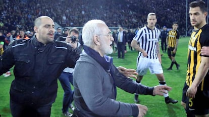 Un policía muerto en Bilbao, cientos de bengalas en el Parque de los Príncipes de París, jugadores agredidos por sus propios hinchas en Lille y Londres, futbolistas del Hamburgo amenazados de muerte con cruces sembradas en su campo de entrenamiento... Y el colmo de todos los colmos: el presidente del PAOK de Salónica, Ivan Savvidis, un exdiputado ruso condecorado por Vladímir Putin, invadiendo el domingo el césped de su equipo con una pistola en la cintura. El Gobierno griego decidió este lunes suspender la Liga y se decretó una orden de detención contra el jerarca del PAOK y otras cuatro personas, presuntamente sus guardaespaldas. No se trata de sucesos del pleistoceno,sino ocurridos en los últimos días en el corazón de la vieja Europa.