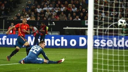 Lopetegui sorprendió al apuntar a Thiago, y no a Saúl, como relevo de Busquets. Lo mismo que al fijar a Rodrigo, y no a Diego Costa, en el perímetro de los zagueros germanos. La segunda apuesta le salió mejor que la primera. El delantero del Valencia es de aquellos que eluden el choque, por lo que suspiran centinelas como Boateng y Hummels, sin lubricante en la cintura. Rodrigo es un rastreador de espacios. No es de los que están, es de los que llegan. Con la Roja, un vivero de centrocampistas de pie clínico, una veta extraordinaria. Se vio en el gol visitante. Iniesta y Rodrigo sincronizaron de maravilla. Al guiño del valencianista respondió el azulgrana con una asistencia telescópica a espaldas de Hummels. Un pase terminal que dejó al jugador del Valencia en un duelo espadachín con Ter Stegen, que no se vence con facilidad. El hispano-brasileño resolvió de maravilla.