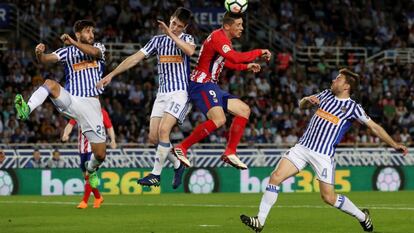 El Atlético, sobre todo defensivamente, es un conjunto de pecados veniales. Rara vez comete uno mortal y lo va a hacer en Anoeta, en un centro lateral y frente a un goleador de postín como Wilian José capaz de pecar a lo grande y a lo pequeño. Potencia, ubicación y oportunidad son sus tres virtudes personales. Y ocurrió que la enésima vez que Januzaj se fue rompiendo la cintura de Vrsaljko (no siempre el jugar cambiado de banda es un matiz que se supera con oficio) centró al área y como por arte de magia tres defensores rojiblancos le hicieron un rondo de coros y danzas para que el brasileño rematase desde exactamente desde el punto de penalti.