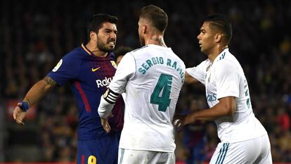 Se exhibieron Barça y Madrid desde el principio fabricando dos goles como dos martillazos, solventados desde atrás hasta presentarse arriba con la violencia de un cañón Suárez y la sutileza de un florete Benzema, que le mató el balón a Cristiano Ronaldo, rápido para ganarle la carrera a Piqué. Y cuando acabaron con el fútbol, o cuando el Madrid se había hecho con él de forma escandalosa bajo la tutela de Kroos y Benzema, empezaron los careos, las patadas y los puñetazos. Para destacar las de Bale y Sergi Roberto; vio el árbitro el puñetazo del segundo y no el pisotón de Bale. Avergonzado o incompetente, en la segunda parte prefirió no ver nada, directamente: ni la patada de Suárez a Varane que acabó con el gol de Messi, ni el penalti de Alba a Marcelo.