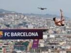 La camiseta ha aparecido elevada por un dron desde el fondo de la instalación, con la ciudad de Barcelona al fondo, mientras se sincronizaba un salto por parte de Adrià García, tras veces campeón de España de la especialidad, desde una plataforma de diez metros.