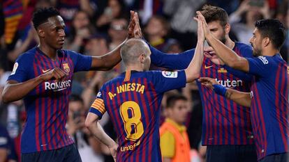 El gol animó al Barça y a Iniesta al tiempo que Valverde cambiaba a Coutinho por Messi. El 8 y el 10 se iban a juntar por última vez durante 20 minutos para disfrute del Camp Nou. El encuentro se agitó y se agigantó Iniesta. No paraba el capitán, a veces asociado a Messi y en ocasiones solista excelso, perseverante en el pase, exquisito con sus croquetas, empeñado en enfocar a Moyá a pesar de la marca de Illarra. El rosarino se había propuesto cerrar como se merecía la fiesta de Iniesta. El capitán no paró hasta que a falta de 10 minutos fue sustituido por Alcácer. El estadio se puso en pie y de forma solemne despidió a Iniesta.
