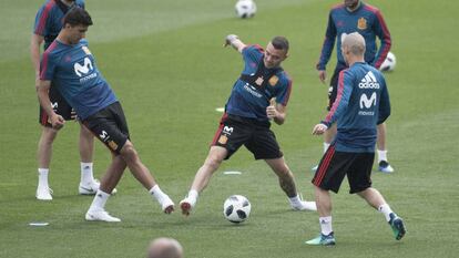 Lopetegui lleva dos años especializándose en comprimir los entrenamientos de forma que en un rondo se puedan concentrar todos los componentes del juego. La preparación física específica, la respuesta neuromuscular y el elemento cognitivo se ajustan en estos ejercicios sencillos, sintéticos, reducidos en el espacio y el tiempo. Es la metáfora de una época de vértigo productivo. También es el instrumento que utiliza el seleccionador para reforzar su idea del aprovechamiento de los espacios para que corra Diego Costa, el nueve que más le cautiva.