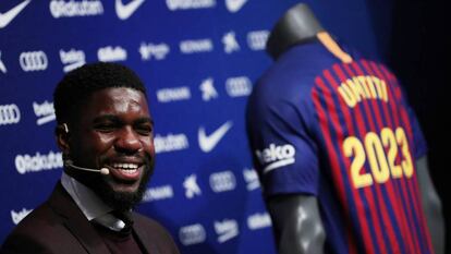 Cogió un jet privado desde Francia, después de disfrutar de dos días de fiesta tras disputar un duelo con la selección en Niza, apareció por Barcelona con prisas pero con la sonrisa puesta, firmó su renovación con el Barça y se puso delante de los micros para volver a coger un avión directo a Clairefontaine [estaba citado a las 16.00 horas], ciudad deportiva de la selección gala, que ya prepara el próximo Mundial de Rusia. Samuel Umtiti (Yaundé, Camerún; 24 años) está de enhorabuena porque se ha ganado un sitio en la zaga bleu del mismo modo que también ha conquistado al barcelonista, una plaza en el once de Valverde y ahora una renovación por cinco temporadas, hasta el 30 de junio de 2023. Aunque la prolongación de su contrato azulgrana no ha sido sencilla.