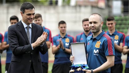 Pedro Sánchez ha entregado este martes al futbolista Andrés Iniesta la Real Orden del Mérito Deportivo en categoría de Gran Cruz en la Ciudad del Fútbol de Las Rozas (Madrid). El presidente del Gobierno estuvo acompañado por Luis Rubiales, presidente de la Federación Española de Fútbol, y por todos los integrantes de la plantilla que representará a España en el próximo Mundial de Rusia que arrancará el 14 de Junio.